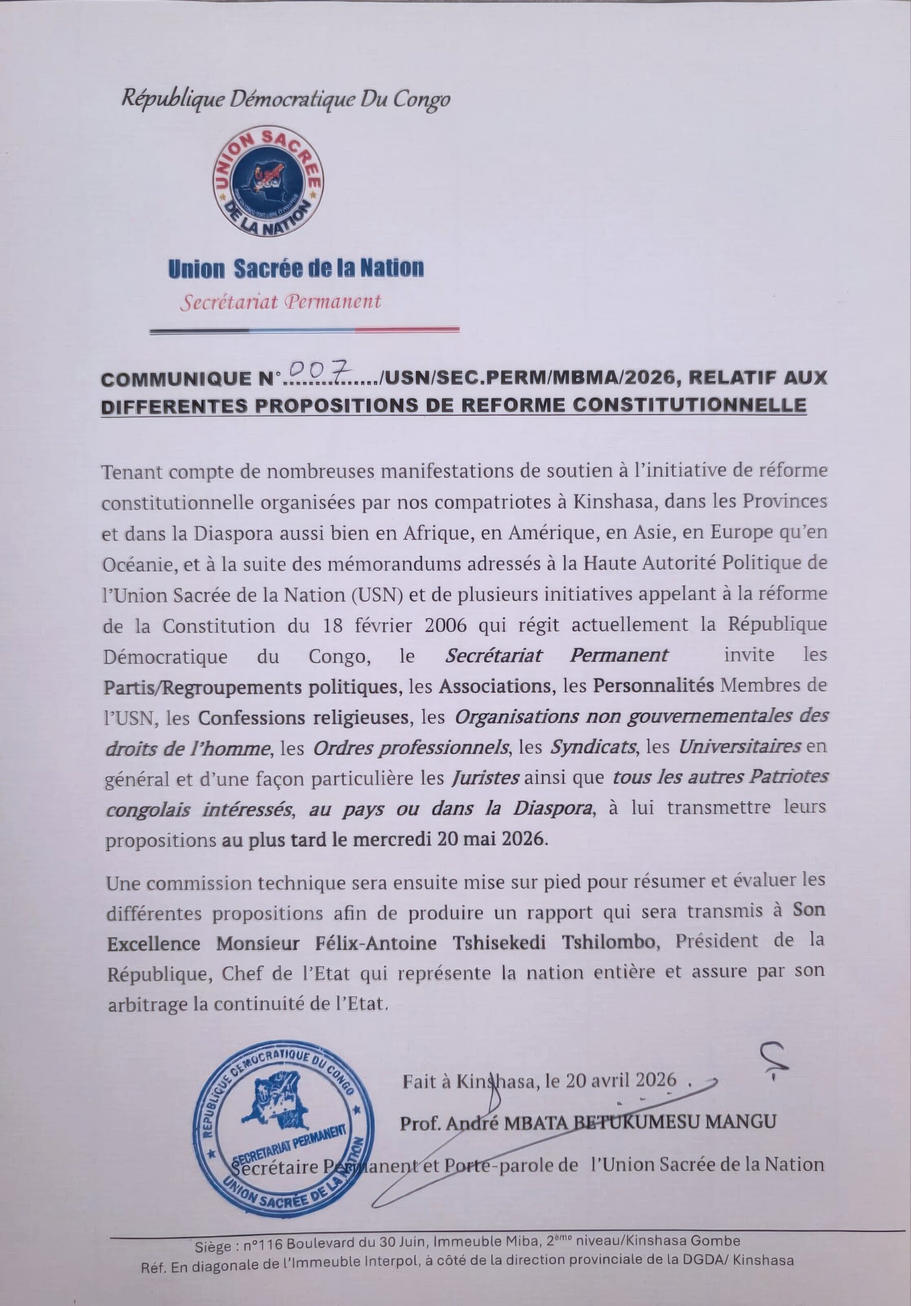 Communiqué très important signé par le Secrétaire Permanent de l’Union Sacrée de la Nation (USN), Prof André Mbata Mangu