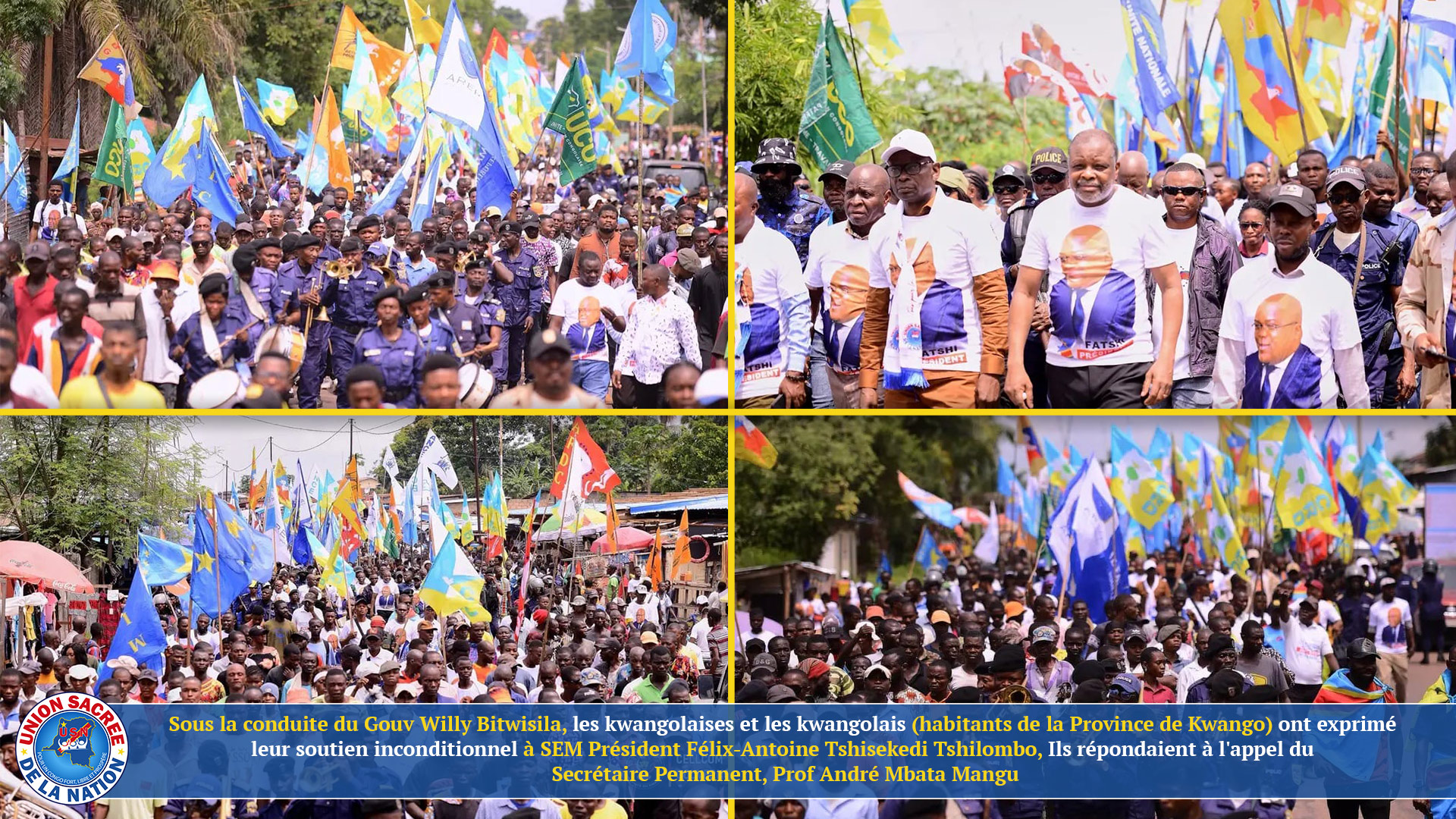 Sous la conduite du Gouv Willy Bitwisila, les kwangolaises et les kwangolais (habitants de la Province de Kwango) ont exprimé leur soutien inconditionnel à SEM Félix-Antoine Tshisekedi Tshilombo, Président de la République, Chef de l’Etat et Haute Autorité Politique de l’Union Sacrée de la Nation et dit non à l’agression rwandaise. Ils répondaient à l’appel du Secrétaire Permanent, Prof André Mbata Mangu